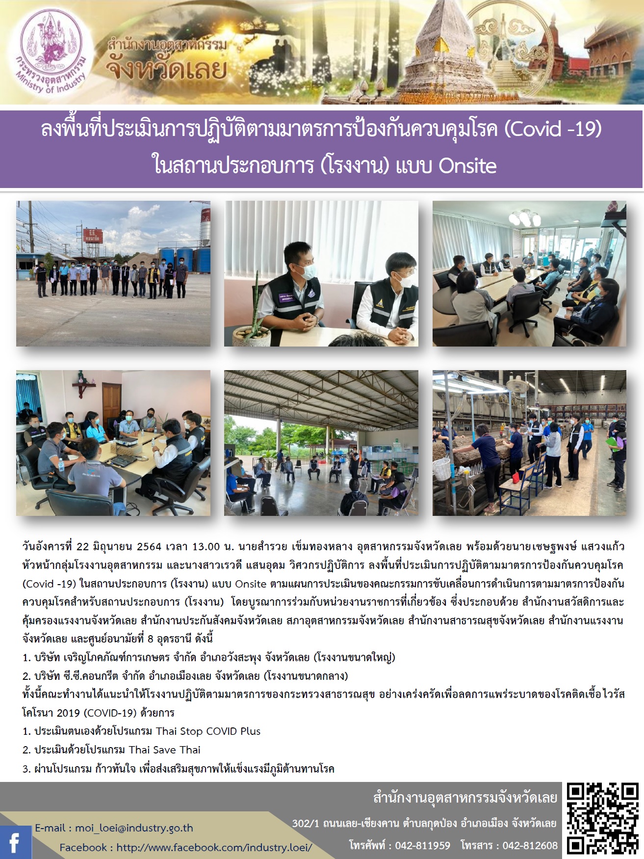 วันอังคารที่ 22 มิถุนายน 2564 เวลา 13.00 น. นายสำรวย เข็มทองหลาง อุตสาหกรรมจังหวัดเลย พร้อมด้วยนายเชษฐพงษ์ แสวงแก้ว หัวหน้ากลุ่มโรงงานอุตสาหกรรม และนางสาวเรวดี แสนอุดม วิศวกรปฏิบัติการ ลงพื้นที่ประเมินการปฏิบัติตามมาตรการป้องกันควบคุมโรค (Covid -19) ในสถานประกอบการ (โรงงาน) แบบ Onsite ตามแผนการประเมินของคณะกรรมการขับเคลื่อนการดำเนินการตามมาตรการป้องกันควบคุมโรคสำหรับสถานประกอบการ (โรงงาน) โดยบูรณาการร่วมกับหน่วยงานราชการที่เกี่ยวข้อง ซึ่งประกอบด้วย สำนักงานสวัสดิการและคุ้มครองแรงงานจังหวัดเลย สำนักงานประกันสังคมจังหวัดเลย สภาอุตสาหกรรมจังหวัดเลย สำนักงานสาธารณสุขจังหวัดเลย สำนักงานแรงงานจังหวัดเลย และศูนย์อนามัยที่ 8 อุดรธานี ดังนี้